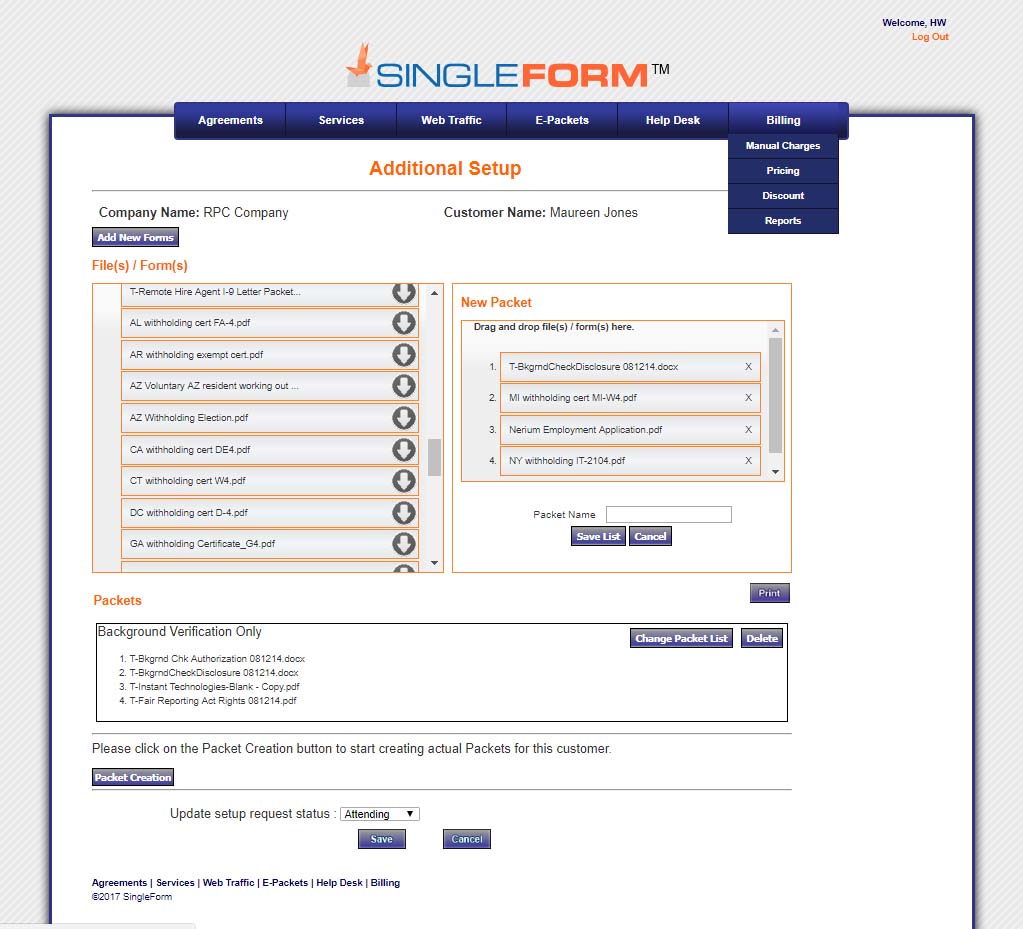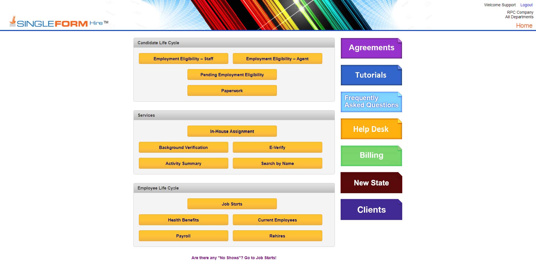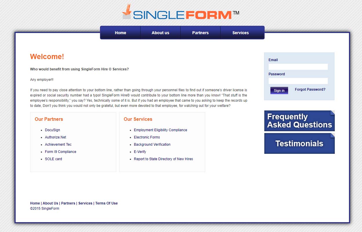Single Form is a web-based platform for staffing companies to register for various services that are offered by Single Form on its service site StartRight. Services that are offered by Single Form to its customers are new hire report to texas workforce commission [TWC], e-verify - electronic document verification, candidate background verification, payroll card by TFG.