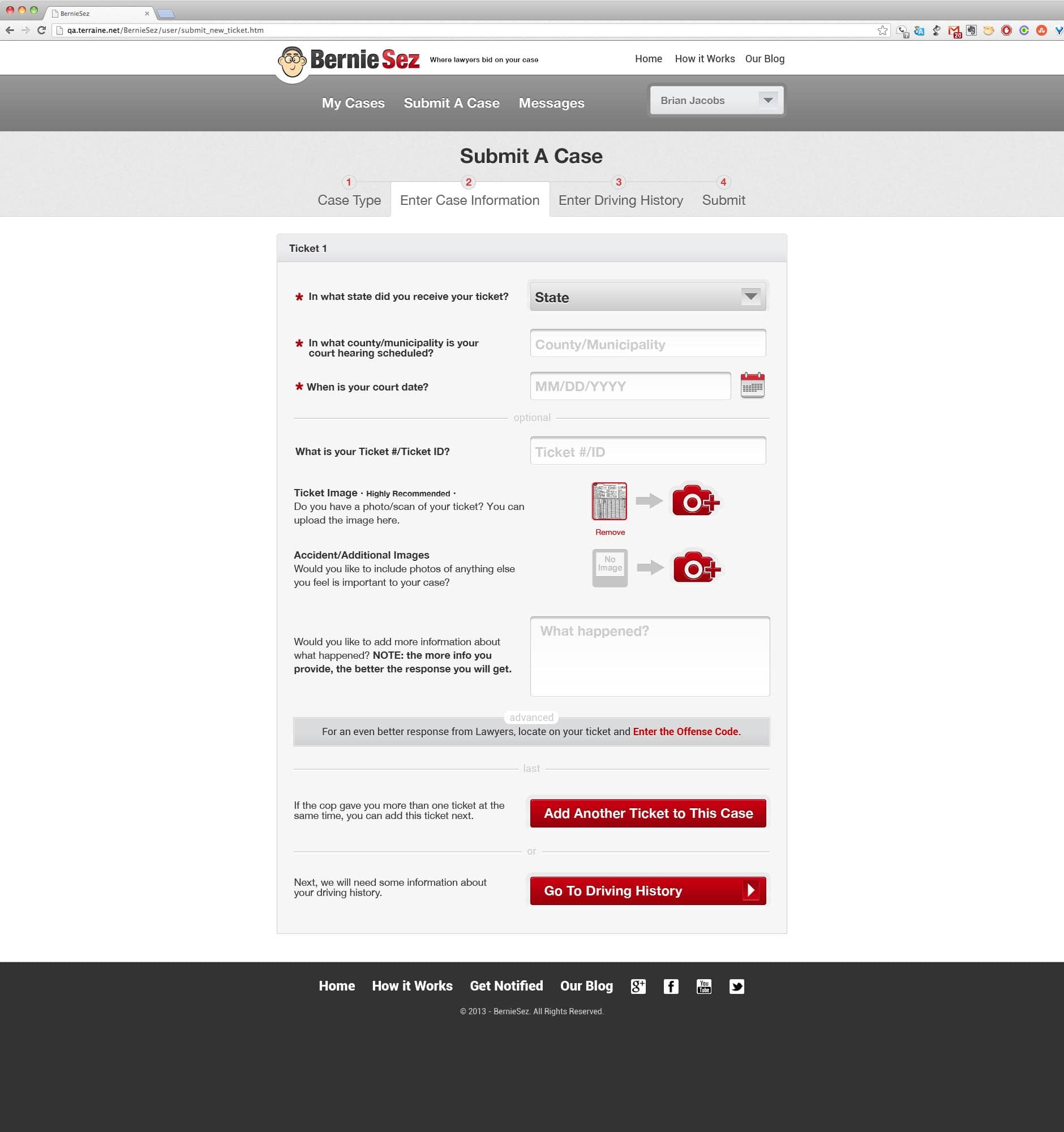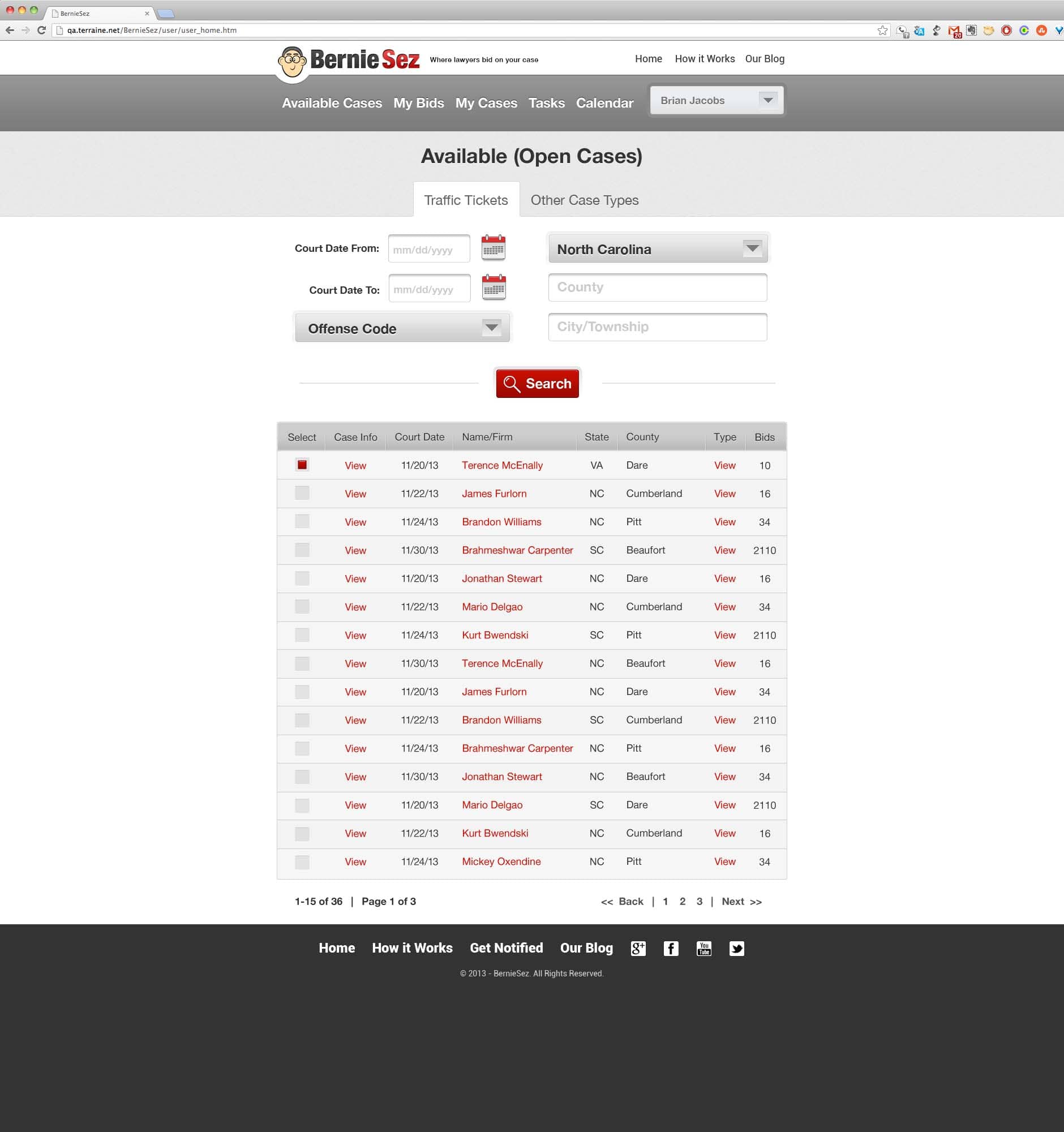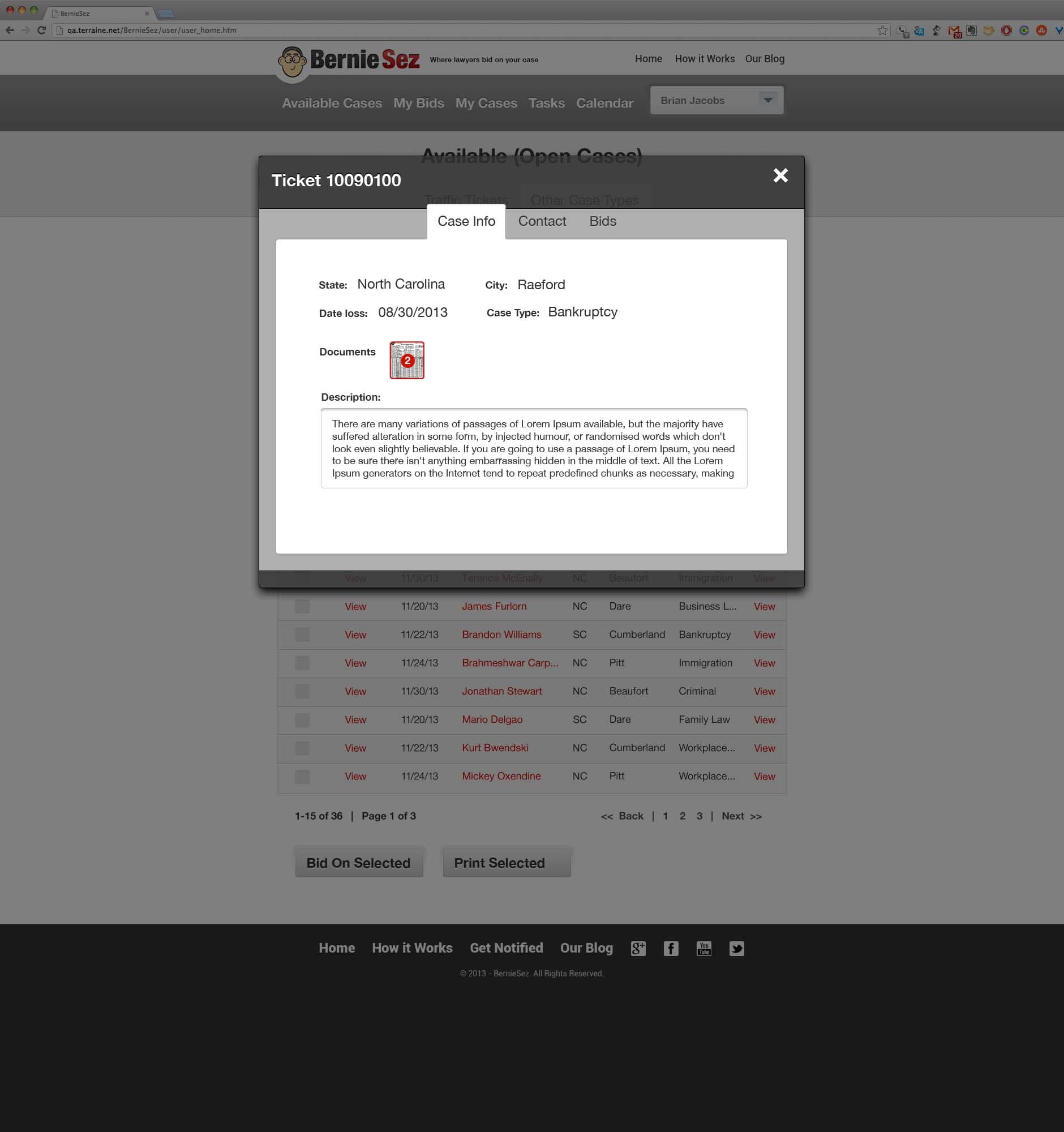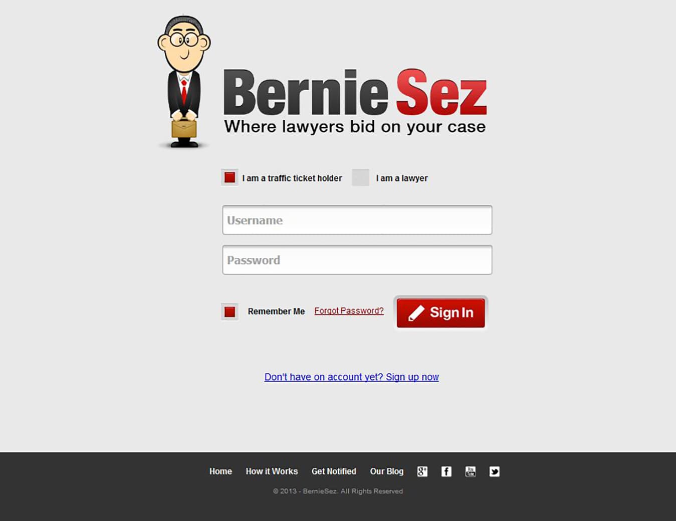 BernieSez is a web based bidding application that provides a platform for law offenders (speeding, disorderly conduct etc.) to post their cases as tickets and for lawyers to bid to represent these people. The application has two types of accounts i.e. User Account & Lawyer Account which are created by the user filling separate registration forms in order to enter into the application.